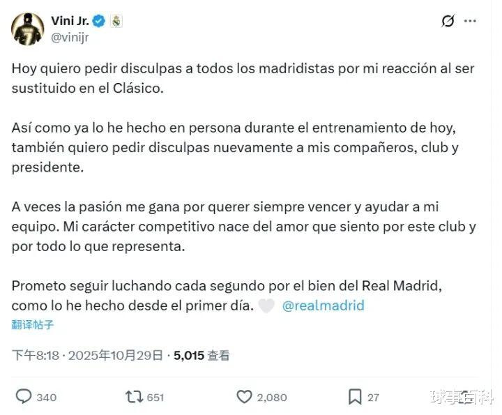 由于皇马在国家德比获胜后获得了2天休息时间,因此维尼修斯、阿隆索等相关人士均未公开发声。当地时间周三,皇马恢复训练之后,维尼修斯通过个人社交媒体就不满被换下向皇马球迷、队友、俱乐部和主席致歉,唯独没有提到主教练阿隆索。